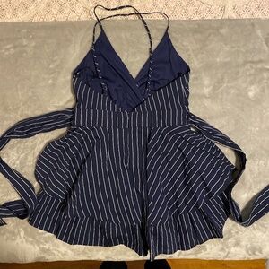 Lulus romper with a navy blue/ white striped pattern. Perfect for date night or a winery!