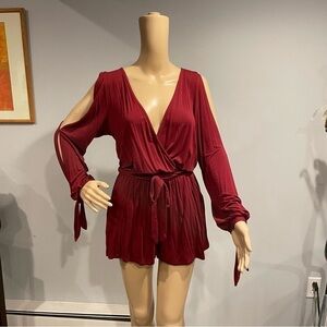 Lulus romper long sleeve shorts belt tie peekaboo-sleeves burgundy M wrap