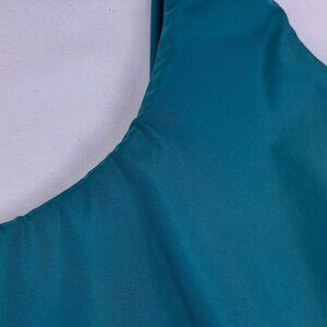 This green top has a scoop neck with 1" wide shoulder straps. Slight ruching at the sides of the bust. Pull on styling. No bra cups. Easy to pair with swim bottoms or shorts.