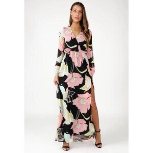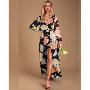 Lulus sz M Wondrous Water Lilies Maxi Dress Black Floral Print Wrap V-Neck Slit