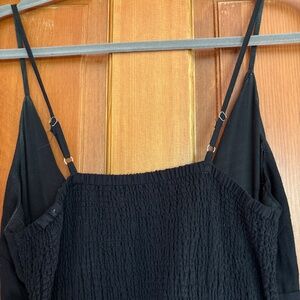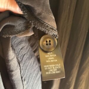 Great fabric, soft and stretchy. All the buttons are real. Adjustable straps. Front ties together in a bow. Midi length.