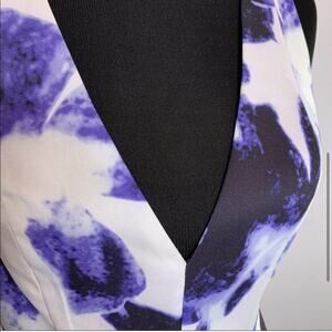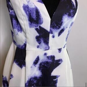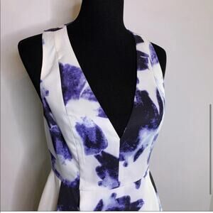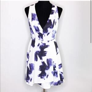 Lulus white and blue floral faux wrap dress. Sleeveless with deep V neckline. Pleated at waist. Faux wrap skirt. Zips in back. Darts at bust. Fully lined. Size small. Excellent preowned condition. Minor wash wear. 100% polyester.