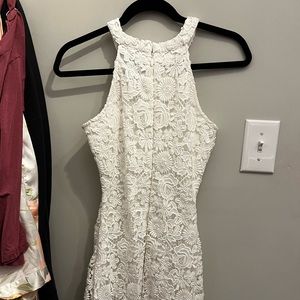 Beautiful and classy white dress with lace overlay - perfect for bridal shower, bachelorette, Easter and more! Only worn twice - in like new condition.