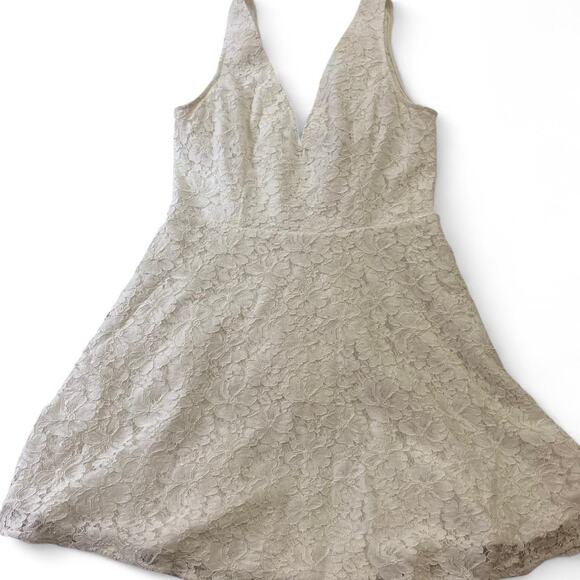 cream lace, A-line dress, mini length, intricate lace, back zipper, feminine style, elegant, textured fabric, vapid white, vintage-inspired