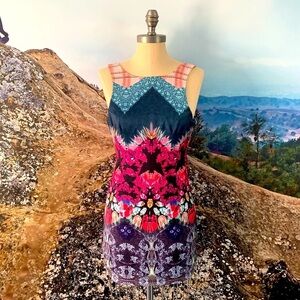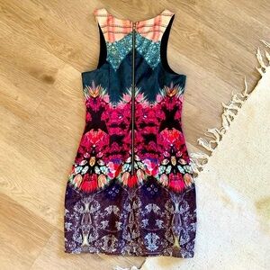 Multicolored printed bodycon dress. Racer back style with gold zippered back. Fitted close to the body. Pink, teal, purple, yellow and more. Perfect condition with no rips stains pills or odors.