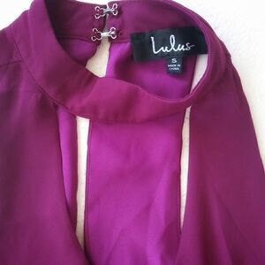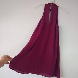 Rich cranberry color double layer crepe sleeveless, collar dress in flowing style! Simple, elegant, excellent condition:) Knee length 34".