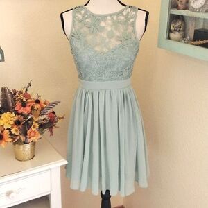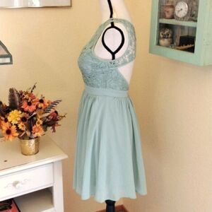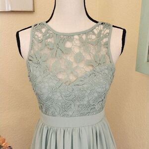 This beautiful dress has so many lovely details. The bodice is guipure lace over a sweetheart lining. There is a built in bra. The back is open so YOU show. Fully lined full chiffon skirt. Size S measures 36 at chest, 25 at waist, full skirt, 35 long from shoulder to hem. So pretty!
