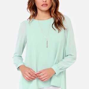 LULUS Exclusive Trade Secrets Mint Green Top, size small. Perfect condition! Lulus Exclusive! Take a personal day and enjoy the Trade Secrets Mint Green Top, we won't tell! Bateau neckline, subtle shoulder pleats, and lightly puffed long sleeves give this lightweight Georgette top a casual chic look. Keyhole on back (with top button closure) sits central above a pleated back that ends at a high-low hem. Unlined; sleeves are sheer. Shirt measures 5" longer at back. 100% Polyester. Hand Wash Cold.