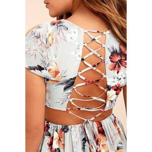 ✨Lulus La Brea Grey Floral Print Backless Lace-Up Sz Small Dress✨