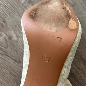 Cream colored lace mid/ankle boots from Lulus. High heel, pointed toe. Good condition, size 9