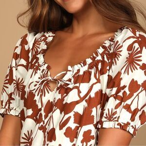 Lulus Exclusive! Make your day a little sweeter with the Lulus x LUSH Completely Cute White and Brown Floral Print Babydoll Dress! Woven cotton poplin, with a bold brown floral print, shapes this dress that has an elasticized scoop neckline (with tying closure and keyhole) and puffy short sleeves with elastic ruffle cuffs. The relaxed babydoll silhouette continues down to a seamed mini hem.