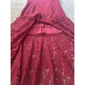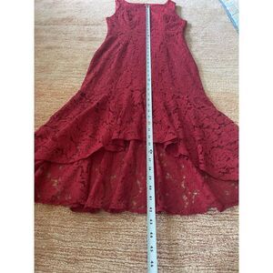 Elegant Lulus red sleeveless lace dress in size M featuring a fitted bodice, open back, and dramatic high-low layered hem. Made from 60% cotton and 40% rayon with a 100% polyester lining. Back zipper closure. Approx. measurements: pit to pit ~16”, length (longest) ~45”. Style D2107AL. Excellent pre-owned condition with no noted flaws. Perfect for cocktail parties, weddings, and special occasions. Hand wash cold, line dry.