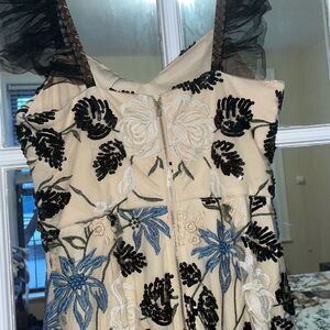 This dress features a mix of sequins , embroider and appliqué textured floral prints with flutter cap sleeves and a sweetheart neckline.
