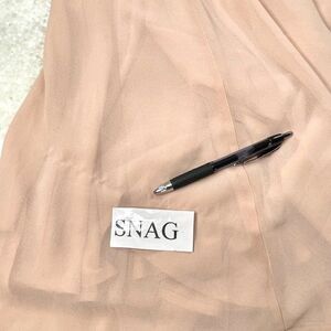 FLAW- there is a very small snag and light run that can be seen in pen photo. It’s not noticeable unless you carefully inspect the dress.
