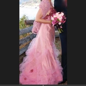 Intricate handwork in the embroidery, beading and lace appliqué bodice, couture draping, deep v-neck, tulle skirt can be bustled. Exquisite tailoring. Worn once. Luly Yang wrap and beaded shoes (size 7.5) also available.