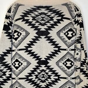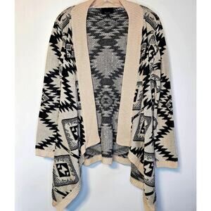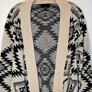Lumiere Aztec Print Cardigan Sweater Black & Tan Tribal Design Western Boho Sz Sn. Beautiful condition! Layflat measurements are: length (high/low) 26/32; chest 25; sleeve length 24.