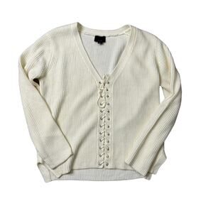 Lumiere Cream Chunky Cable Knit V-Neck Lace Up Sweater Size Medium