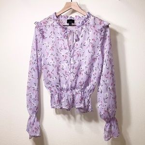 Lumiere woven floral light pink purple long bell sleeves blouse with front tie string neck. Worn few times in 2019. No flaws. No stains. Please see images for details.