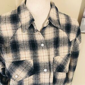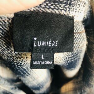 Lumiere Plaid Utility Shacket. Excellent preowned condition. Size large. Snap front, soft flannel top shirt/ shacket.