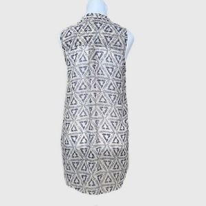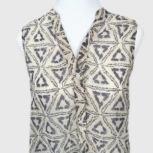 Lumiere light and airy blue and cream sleeveless top . It has a fun triangle print, with buttons down the front and a long hi-low hem. It would be great to wear with a pair of leggings, skinny jeans, etc.