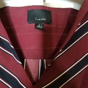 Excellent used condition. Lumiere burgundy and navy striped pullover blouse. Button cuff sleeves, split hem, ties at v-neck.