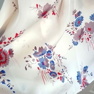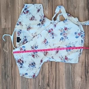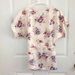 Lumiere floral print wrap blouse size S. There is a tie inside that is adjustable as well as the outside tie. Cream in color with a blue and red floral print. This item is in good used condition so there are some minor imperfections please see
