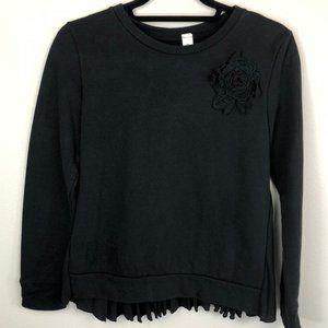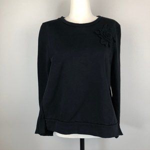 This Lumina black sweatshirt has an three dimensional appliqué flower on the front and adorable pleated chiffon panel across the back. Gently worn in very good condition with no fading. Made in Italy. Measures to be about a size small/medium.