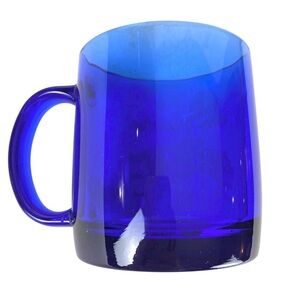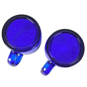 The a set of 2 Luminarc Cobalt Blue Etched Running Wolf mugs or coffee cups made of glass, featuring a blue color and an etched design of wolves. The mugs are part of the Wolf themed collection. Each mug includes an etched image of a running wolf, adding a unique touch to the glassware set.