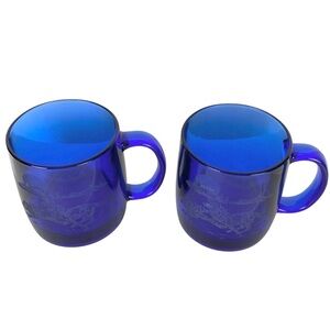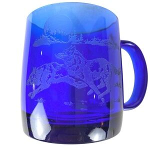 Luminarc Cobalt Etched Running Wolf Mugs Set Of 2 Blue Coffee Cups