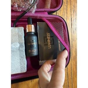 Includes: Original Luminess branded hard carrying case, airbrush compressor (sealed in plastic), rose gold stylus (cleaned, with 'Clean Stylus After Each Use' label), power cord, user guide and 'Learn to Airbrush' Getting Started DVD, 0.5 fl oz Velvet Veil Skin Perfecting Serum, additional boxed Luminess airbrush item (contents unopened), and foam protector insert.