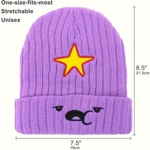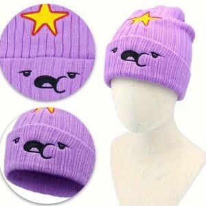 Adorable purple beanie featuring adventure time character lumpy space princess.