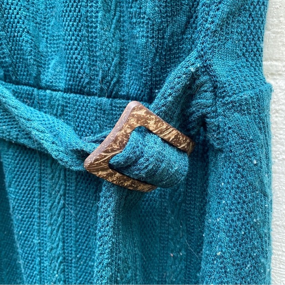 Luna Chix Cable Knit Sleeveless Sweater Dress. Color is a beautiful forest green with a blue hue. It is more green in person than the photos show. Belt detail. Slit with button details. Minor wear including pilling. Size Medium. Stretchy fabric. Underarm to underarm measures 17” across with stretch to 22”. Full length from top of shoulder to hem measures about 46”.