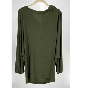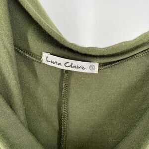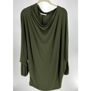 Luna Claire green mini dress or tunic with exaggerated dolman sleeves and draped neckline. Very loose fitting and fitted at hip and thigh. Long, loose sleeves with elastic around cuffs (elastic is also loose on my medium frame). OS - One size fits most. Very good used condition.