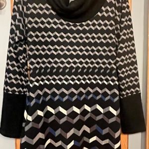 Lightweight sweater material. Black and multicolored pattern. Pair with leggings or skirt, tights and boots!
