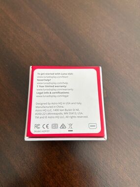 Luna Display Mini DisplayPort adapter in original packaging. White box with red accent and Luna logo. Compact and travel-friendly packaging.