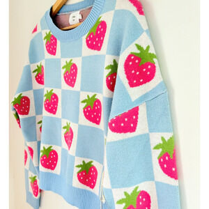 Pastel blue and white checkered sweater with vibrant pink strawberries all over.