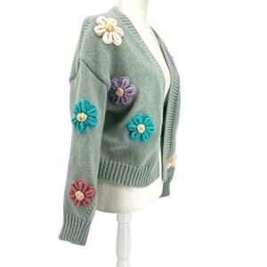 Luna Ivy Women's S Oversized Short Spring Bloom Green Chunky Knit Daisy Cardigan