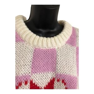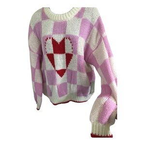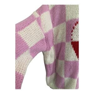 Luna Ivy pink white checkered red white heart crochet style sweater size medium brand new
