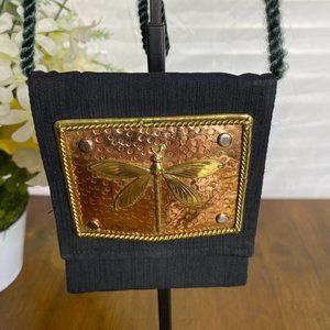 Very uniquely designed purse by Lunacy Designs with Hammered Metal Dragonfly Plate on front. Looks like copper/brass but unknown for sure what kind of metal it is made from.