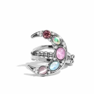 Featuring dainty pearl accents, a silver crescent moon is dotted with a rose gem, a UV-shimmery pink oval, a cloudy pink oval, an opalescent blue oval, and a round pink cat's eye stone for a unique luminescent centerpiece. Features a dainty stretchy band for a flexible fit. Sold as one individual ring.