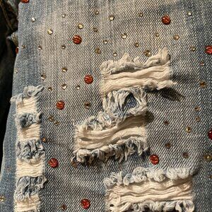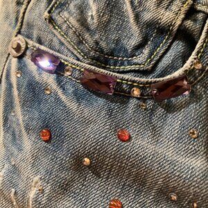 A gorgeous pair of capri length jeans by Lunatic. Purchased in Italy and gently used, the legs have rips and are encrusted with crystals and cabochon pink stones. There are some large crystals sewn on the outline of the front pockets. The bottom is turned up with a fabric latch and button.