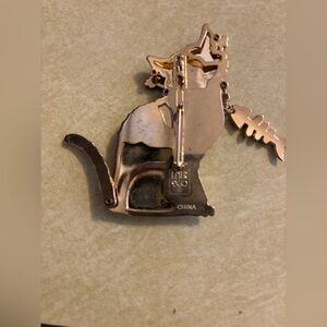 The product is a vintage cat pin featuring the Lunch at The Ritz brooch. The black and white enamel design features a cute cat with a fish bone pendant. Does have minor wear and tear. It is a type of pin that can be worn on clothing or accessories. This piece falls under the category of Vintage & Antique Jewelry, specifically Brooches & Pins. This cool cat measures 2” long. The bracelet measures 8” long. Comes with original box and paper, in good condition.