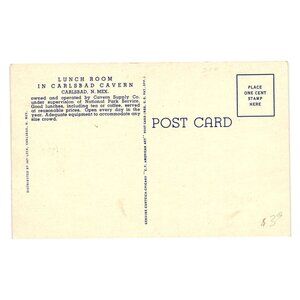 This vintage postcard features the iconic Lunch Room in Carlsbad Cavern, New Mexico. Produced by C T American Art and distributed by Jay Leck, in good collectible condition.