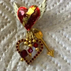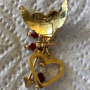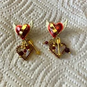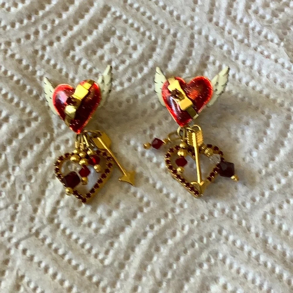 Winged romantic heart earrings with dangling open heart surrounded by red crystals and other dangling crystals and arrow.