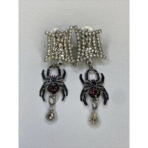 Black enamel spider with red rhinestones dangles from a clear rhinestone