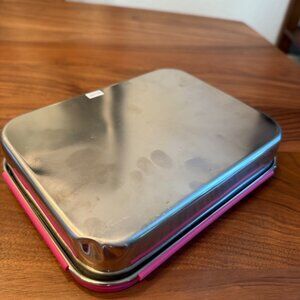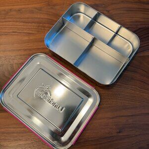 Stainless steel Lunchbots bento box, size large with 5 compartments. It comes with a pink lid, which can be pulled off if you prefer a plain stainless lid.