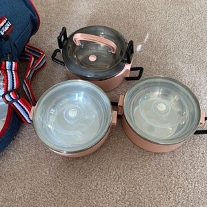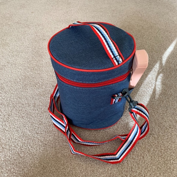 Insulated cylinder lunch box with carrying strap. Has 3 separate containers that snap together. Also comes with utensils and carrying case.