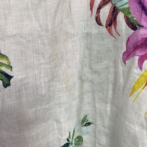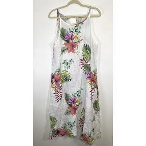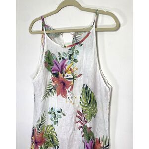Effortlessly romantic, this Lungo L’arno midi dress is a breathable 100% linen beauty made in Italy. Tropical white floral print, strappy top, and breezy side slits make it your dream summer staple. Unlined for easy layering. Approx length: 45". Good condition—missing back button and faint stain (see pic).