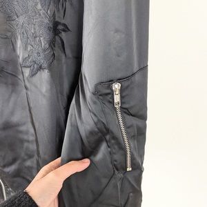 Embroidered Detailing, Rib-Knit Trim, Two Front Pockets, Zipper Pocket At Left Sleeve, Zipper Closure
