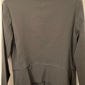 Another beautifully detailed shirt/jacket from Lunn by Lilith. Neckline, front lapels, rear and side trimmed with satin piping. Front has small slits for shaping at the hemline. Sleeves are straight without trim; worn down or rolled. Neck line is dropped slightly in the front, making this more appropriate for a shirt, in my opinion. Color is Black. Size is 2 (Euro). Material isViscose rayon/Nylon/Spandex, so the fabric is slightly stretchy. Sleeve measures 18" from armpit to hem of cuff. Front measurement from just above top button to hem is 19". Rear measures 20" from neckline to hem. Armpit to armpit measurement across the back is 19". Perfect condition, never worn, though price tags were removed.